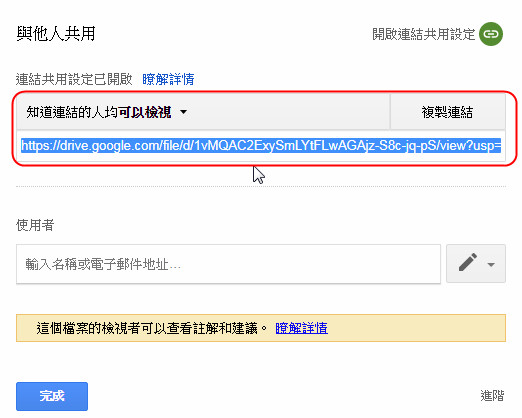 共用的權限設定到「知道連結的人均可以檢示」,我們將這一個分享連結給複製下來。