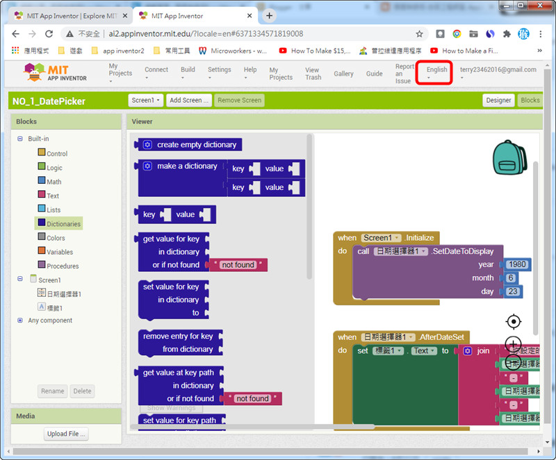 正如我第一次興沖沖的要開始學習 App Inventor的時候,第一次打開介面,居然是英文的,為啥我買的書上的操作介面是中文的。其實呢,App Inventor有支援繁體中文的語系,第一次使用的時候候,要先切換一下。
