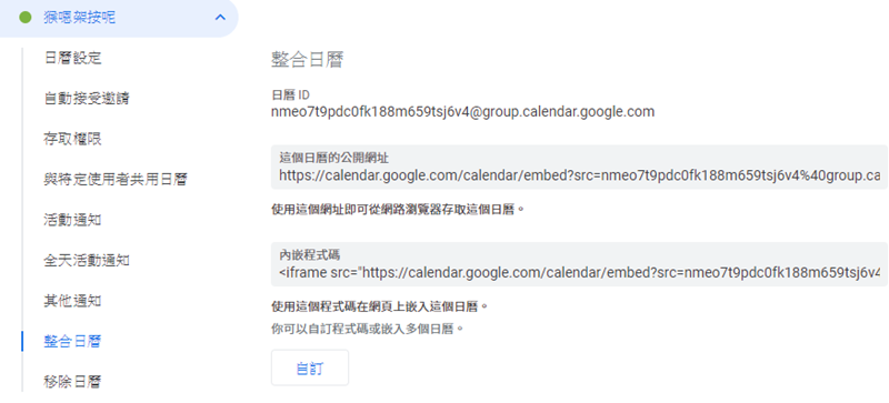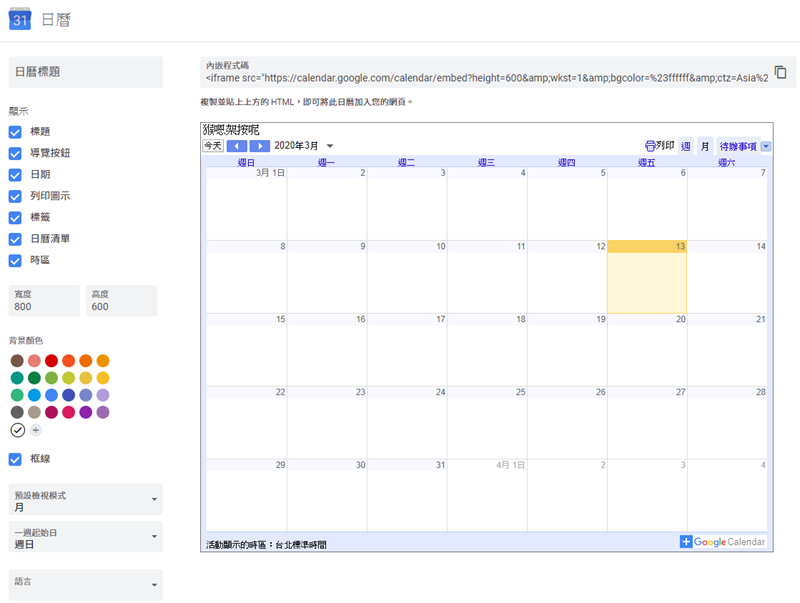 google日曆也提供了自訂日曆的功能,要自訂日曆顯示項目的時候,我們就點一下自訂,然後就可以在右側的工具選擇我們要顯示的項目。一切都確認好之後,同樣的我們把內嵌程式碼這一段複製下來,再貼到網站上就完成了。