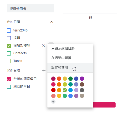 首先我們點擊一下我們要放到網站上的日曆。點擊設定和共用。