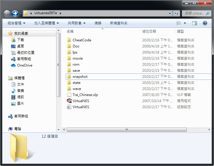 這些是 VirtuaNES預設的目錄,如果我們更新模擬器版本的話,只要把這些資料夾整個複製過去的話,基本上就會把所有遊戲的資料給轉到新模擬器上。非常的方便。