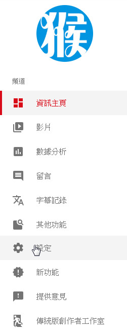 進入到我們的YOUTUBE的頻道之後,點一下左邊工具列的「設定」。