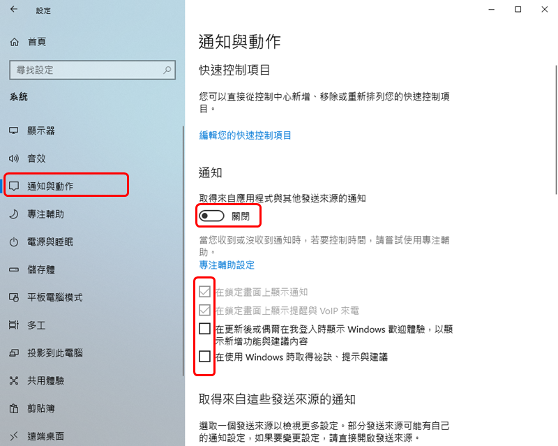 在『通知與動作』這裡,把『取得來自應用程式與其它發送來源的通知』給關閉。