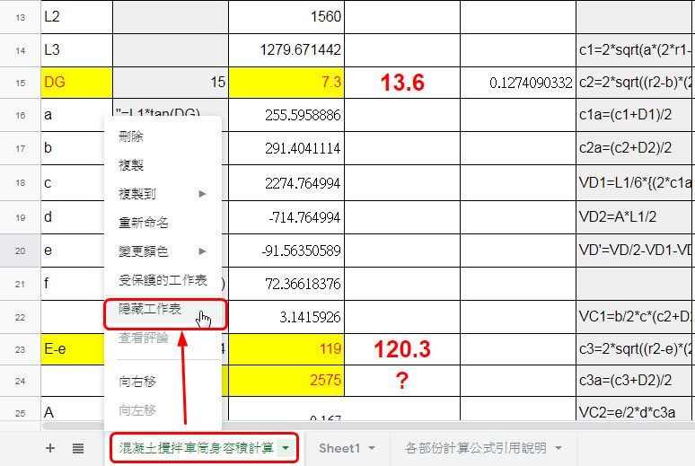 作法非常的容易,我們在任一個工作表上按滑鼠右鍵,點擊隱藏工作表。這樣工作表就會隱藏起來。