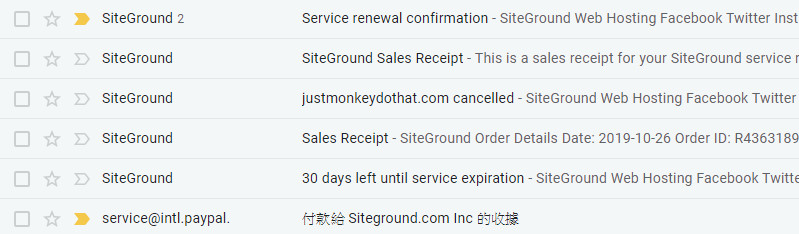 聊天的過程,我一樣是出動 google翻譯的功能請 siteground的客服把我用信用卡誤刷的帳單先退掉,然後提供一個用 paypal付款的連結來讓我付款。整個過程都在 siteground的線上客服完成,付款、退款、提供 paypal的付款連結、付款完成,主機期限確認,通通在半個小時完成。細項我就不提了,每一步我們就會收到從 siteground寄來的通知信件。