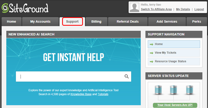 這次整個退款過程中,最麻煩的部份,就是找到線上客服了,所以這裡就來介紹一下這個最麻煩的部份。我們登入 siteground之後,點 Support
