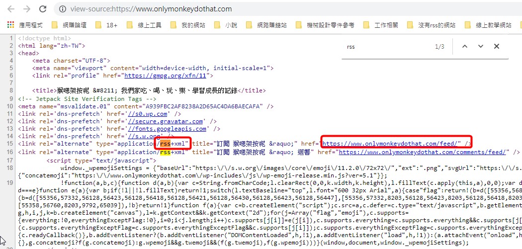 比較麻煩一點的方法是查看網頁的原始碼,按ctrl+f來搜尋rss,這樣就可以找到Rss的連結。