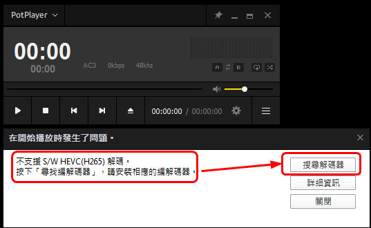 首先我們要開啟 HEVC(H265)影片格式的時候,會跳出不支援 HEVC(H265)的訊息。影片就會變的有聲音沒有影像。順帶一提我 Potplayer的版本是 10/31更新的,版本別是1.7.20977版。