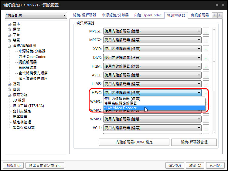最後,我們再 HEVC這一個項次中,把解碼器選擇為「LAV Video Decoder」,再按下確定。