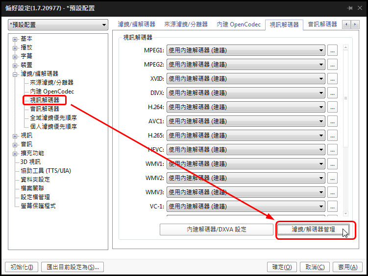 依序找到「視訊解碼器」中的「濾鏡/解碼器管理」。