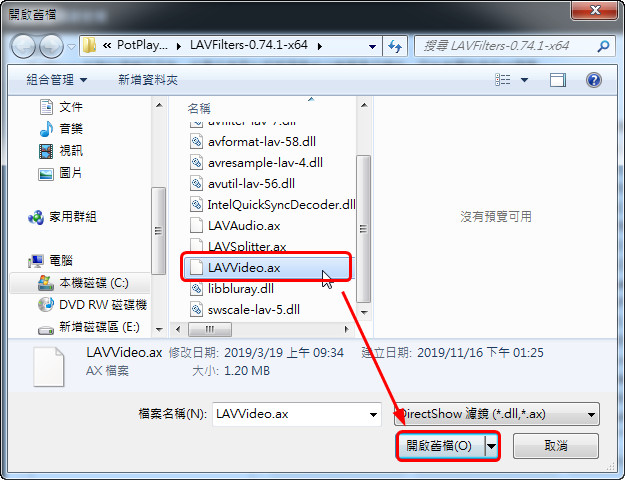 選擇我們下載回來的編碼器資料夾,資料夾裡頭有一堆檔案,我們只會用到「LAVVideo.ax」這個檔案。點「開啟舊檔」來載入。