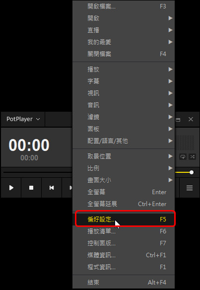 解碼器的部份有了,接著我們就要設定一下 Potplayer的部份。讓 Potplayer在解碼 HEVC(H265)影片的時候,用上我們新下載回來的編碼器。所以我們點一下「偏好號設定」。