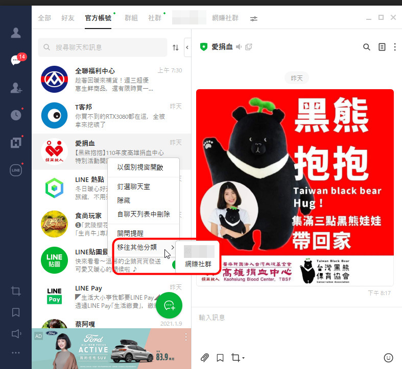 但跟手機版不同的地方是,在電腦版的 line上,我們不但可以新增分類,還可以移動項目。