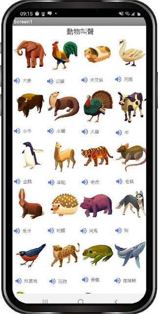 APP運行的畫面如下,我抓了 46種動物的叫聲進去。只要點擊動物的圖片,就會出現那一隻動物的叫聲。這個做完之後,我獲得笨蛋柔的掌聲。