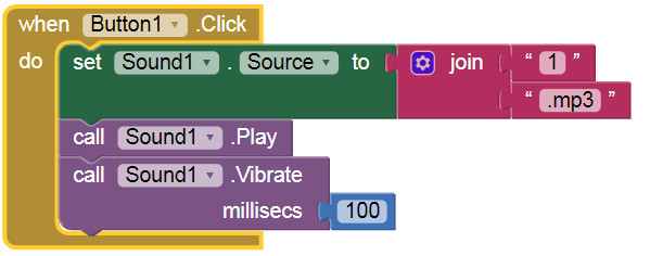 1.設定『Sound1.Source』聲音的來源,這裡用兩個字串組合,”1″以及.mp3″