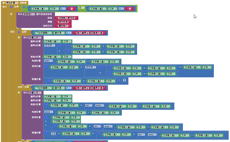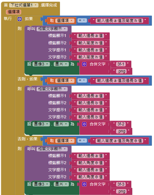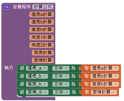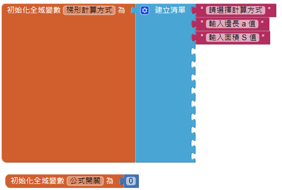 這裡就用下拉式選單來做。把不同的計算方式給建一個清單,放在三角形計算公式這個變數下頭。然後程式開始的時候,就把下拉式選擇的元素設定成變數_三角形計算公式就可以了。