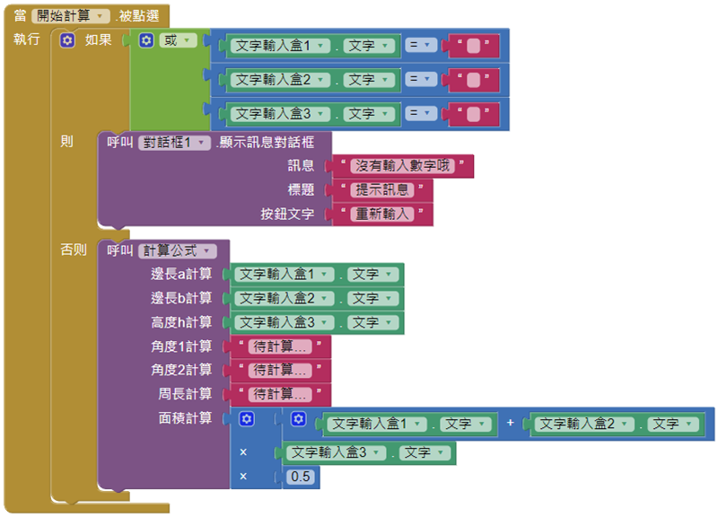 如果文字輸入盒中都有輸入數字的話,則呼叫計算公式這個程式,再從這裡填進相關的值,或者是計算公式。
