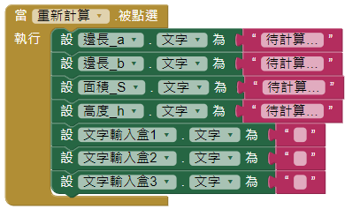 重新計算按鈕被按下之後,把相關的標籤和文字輸入盒的文字,給設定成待計算和空白。