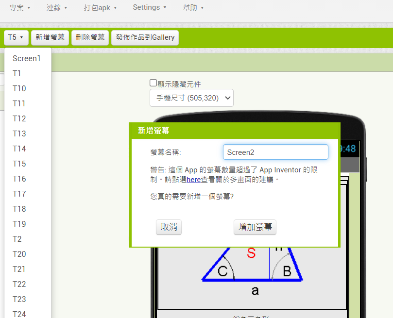 不過,這個不用管它,直接按下增加螢幕的按鈕,還是可以新增螢幕。我就建了 36個螢幕在這個範例中。