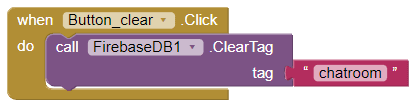 當 clear按下按下的時候,call firebasedb1.cleartag,呼叫 firebase元件,清除 chatroom這個標籤的資料。