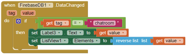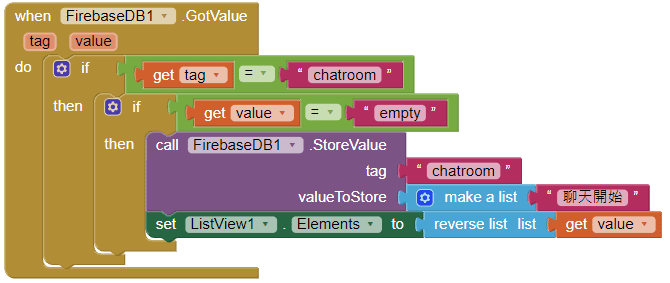 call firebasedb1.getvalue,呼叫 firebase的元件,去取得 chatroom這個標籤下的資料。valueiftagnotthere,如果這個標籤下沒有資料的話,就傳回 empty當它的值。