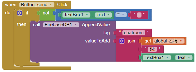 call firebase.appendvalue,呼叫 firebase增加訊息功能。把變數_名稱的值和 textbox1.text輸入的訊息,用文字方塊合併一下,儲存在 chatroom這個標籤下。