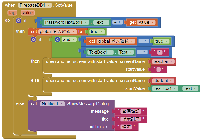 主要就是按下登入按鈕之後,會去呼叫 firebase.getvalue,去資料庫中比對帳號碼是不是正確。如果帳號密碼正確的話,依照不同的登入帳號,開啟不同的頁面,這是為了做使用權限的區分。