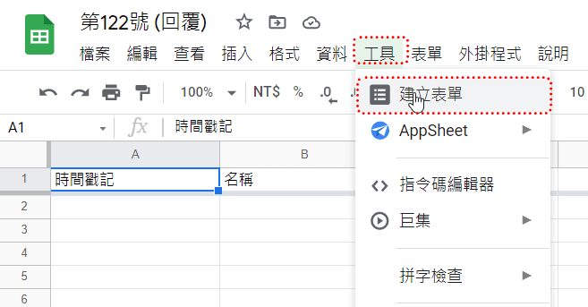 我們也可以先建立一個空白的試算表之後,再依次點擊工具->建立表單的方式,來建立一個新的表單。