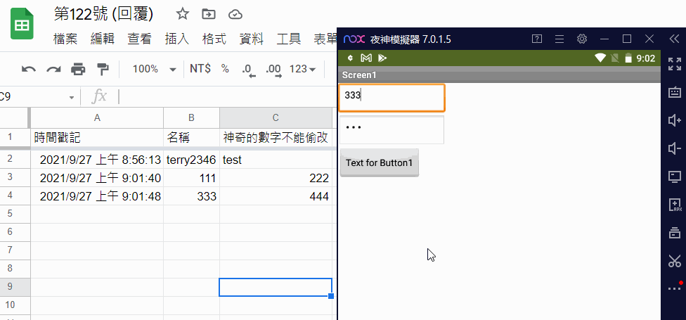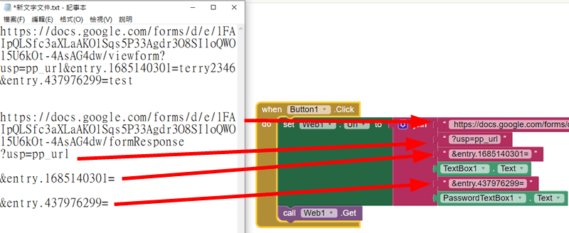 按下按鈕之後,就會把我們輸入在文字輸入盒以及密碼輸入盒的資料,透過 google表單網址文字的組合,把它送到 google sheet中。