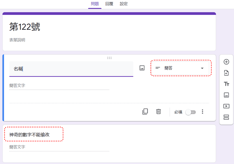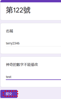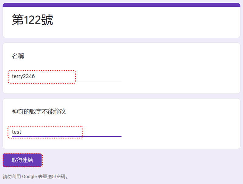 3. 請不要出現 password或是密碼的字眼,所以在這裡我用”神奇的數字不能偷改”來代替。不然我們建好的表單過一陣子會出現違反 google服務條款的字樣。