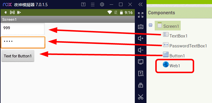 分別放上文字輸入盒、密碼輸入盒,按鈕,以及最重要的 web網路元件。