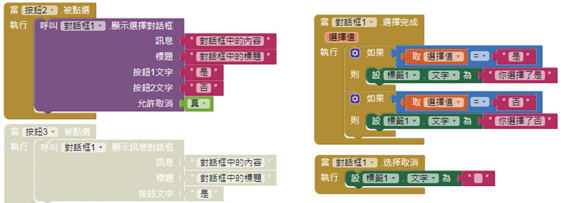 我們在程式區塊中,加入右側的當對話框.選擇完成。