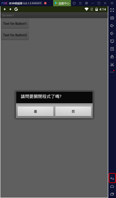 當我們在 Screen1這個畫面下,按下 Back的話,就會跳出上面這個對話框。