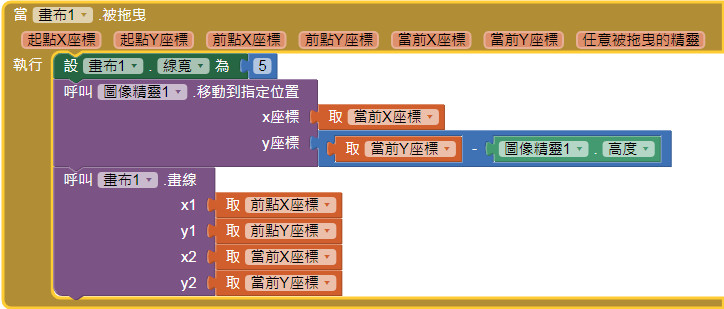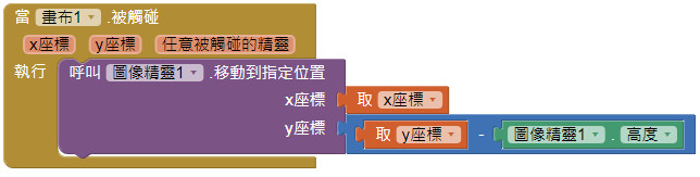 修改圖片被觸碰的圖像精靈的位置後,還要修改一下當圖片被拖曳後,圖像精靈的位置。