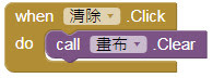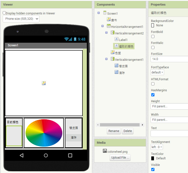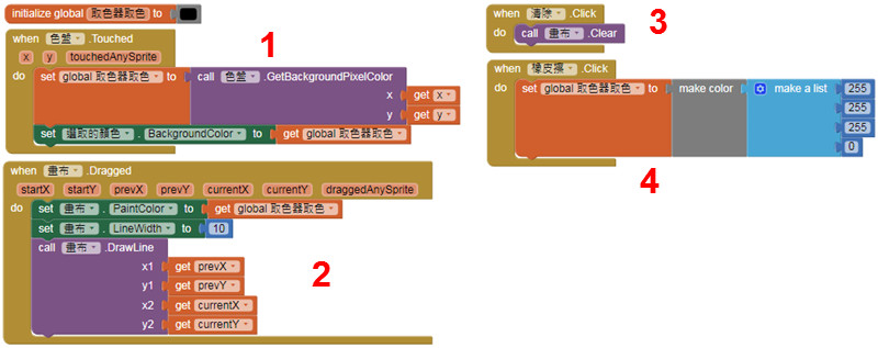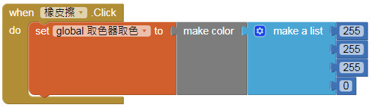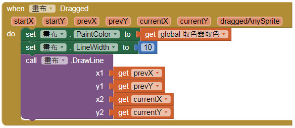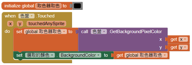 由於用的是畫布中取得背景像素顏色的功能,所以畫面下方的這個調色盤的地方,其實是一個畫布的元件。然後我們放一張調色盤的圖片當這個畫布的背景。然後再用取得背景像素顏色功能,把畫筆的顏色,設定成我們點到的這個顏色。