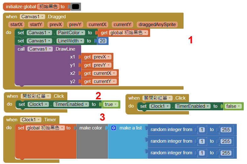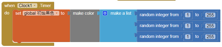 這裡補充一下 app inventor中的顏色是由 R、G、B這三個值,以及一個透明度所組合產生的。上面這個顏色的設定方法,把 RGB三個數值設定為隨機值,透明度沒有設定的話,預設值就是 100。