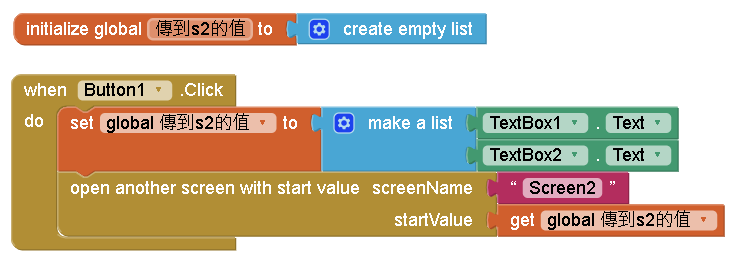 如果我們有多個數值要傳遞到另一個螢幕畫面的時候,我們可以清單元件來做。把值加到一個清單之中,再從這個清單中去讀取需要的數值。