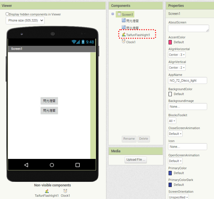 App Inventor學習記錄54,利用TaifunFlashligh外掛,控制手機閃光燈功能