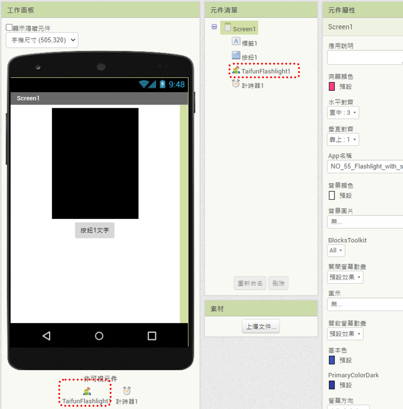 接著上一篇,既然可以控制閃光燈了,我們就利用一下 TaifunFlashlight這個控制閃光燈開啟及關閉的外掛,加上計時器的元件,我們來做一下可以發出 SOS閃光的 APP。