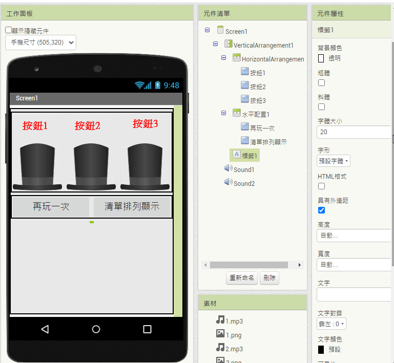 這次要做的是一個猜帽子的小遊戲,每一次都會變化位置,猜對的話,會發出答對的音效,猜錯的話會發出錯誤的音效。重點在於怎麼按鈕隨機排列