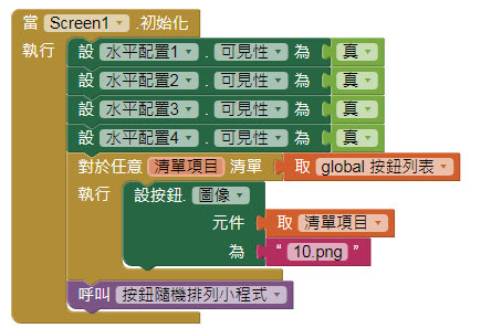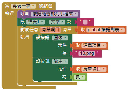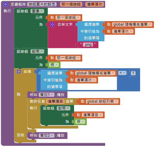 設定按鈕的圖像,元件則設定為,那一個按鈕這個參數。它的值則是用合併文字的方式來做,讓它等於打亂順序清單中的清單項次。
