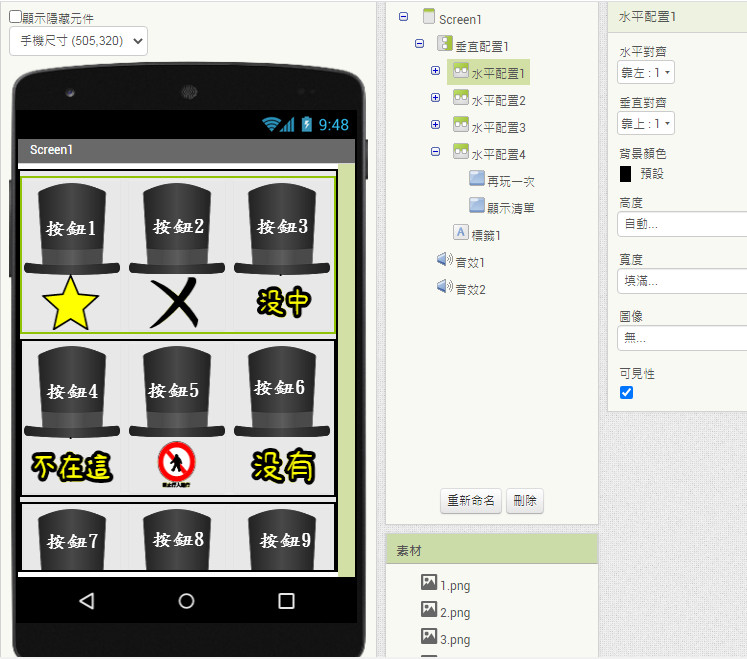 水平配置1、2、3裡頭,會放三個按鈕。三個水平配置都是一樣放三個按鈕。