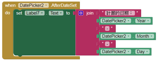 同樣設定當用『DatePicker 2』選取日期之後,『Label 7』的文字內容。