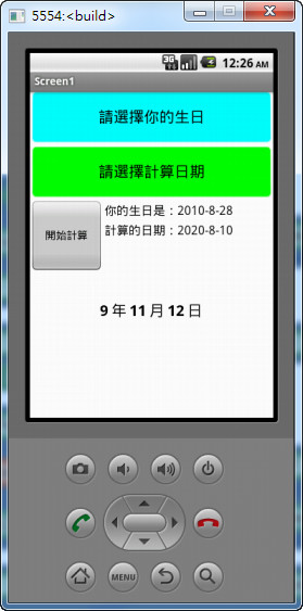 年齡計算器的運行畫面像這樣,從『DatePicer 1』選擇生日,在從『DatePicker 2』選擇要計算的日期。按下開始計算按鈕後,就會算出實際年齡的年月日。