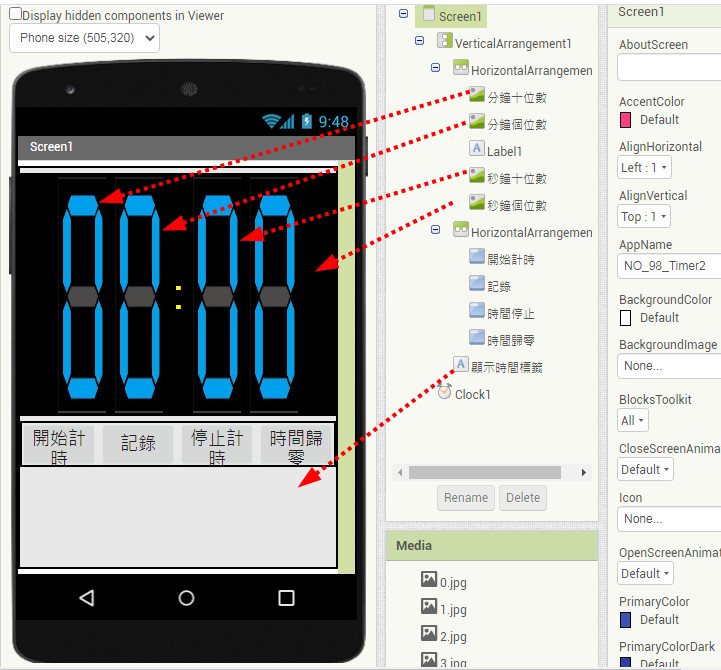 App Inventor學習記錄71,偽七段顯示器做的碼錶,以及碼錶記錄多個數據說明