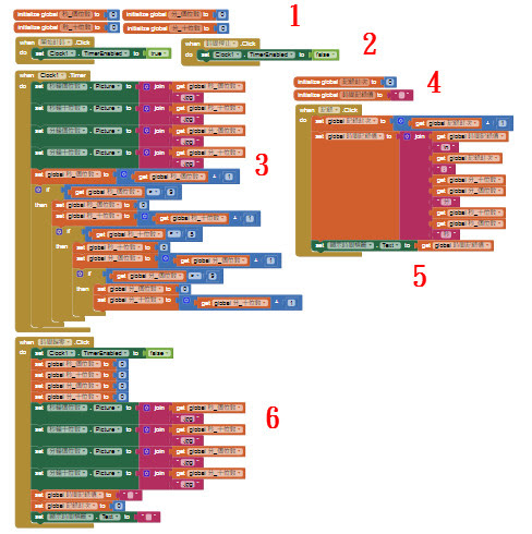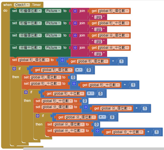 按下開始計時按鈕之後,計時器就會開始作動。在這裡秒數和分數的個位數和十位數,都設定一個變數,每作動一次,就把秒數個位數的變數的值加 1,再依照這四個變數的值去抓照片。
