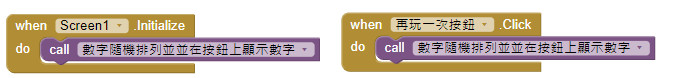 當再玩一次按鈕被按下的時候,呼叫數字隨機排列並在按鈕上顯示數字這個程式。