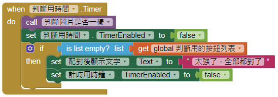 這裡先提前說明一下,這裡的完成條件,就是用流程判斷方塊,去確認判斷用的按鈕列表這個清單是不是已經沒有東西。這樣的話,就代表全部的牌都翻出來了。