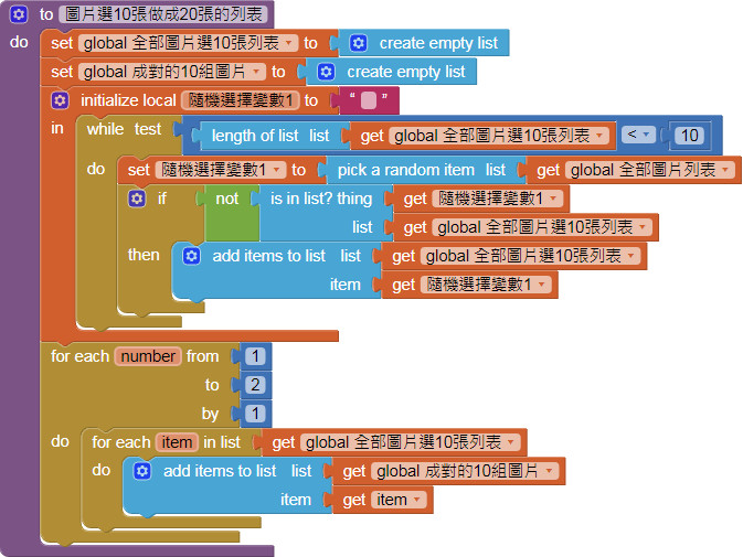 所以再用了一個回圈,把全部圖片選 10張列表中的圖片,依序的加入到成對的 10組圖片中。這個步驟總共做 2次。所以我們就有了成對的 10組圖片可以拿來玩記憶遊戲。