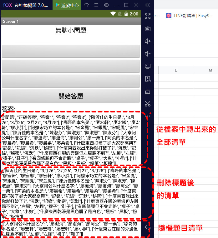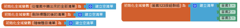 在接下來要做的就是利用隨機題目清單的內容,把它的內容分配給按鈕,讓按鈕顯示相關的文字,然後再做按鈕按下的判斷程式就可以完成一個問答的遊戲。